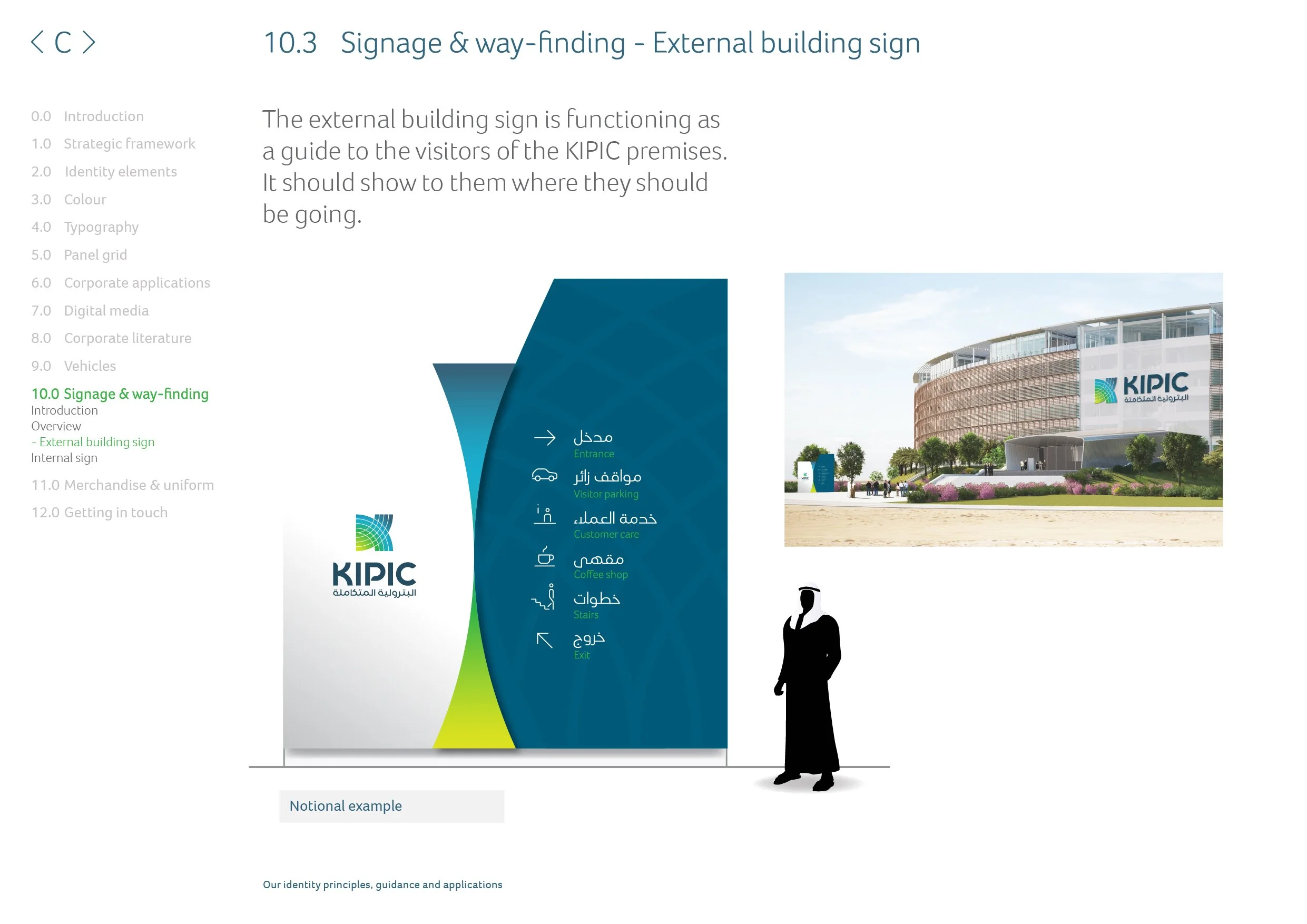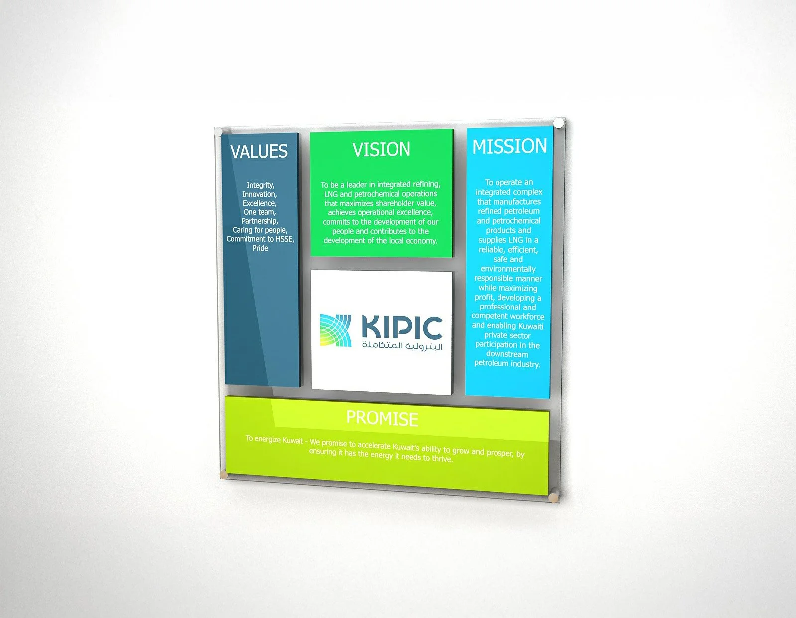 It also represents the knock on ripple effect of which will help diversify the economy, secure the Kuwaiti domestic energy needs and provide growth for the private sector. The logo uses a clean, strong, contemporary logotype for both English and Arabic. This underpins and reinforces the solidity of the company and it’s commitment to Kuwait. The combination of colors in the logo represent (from light green to navy blue) the concepts of optimism, growth, environmental, openness, ambition, confidence and security.